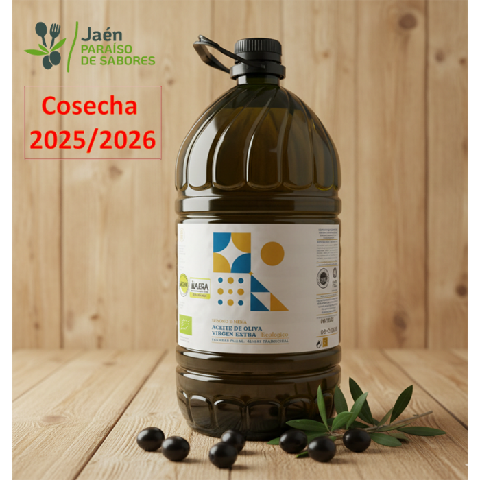 Aceite de oliva virgen extra de la variedad picual, certificado con la D.O. "Sierra Magina", procedente de aceituna recolectada a partir del mes de noviembre con un mayor grado de maduración que el de cosecha temprana.