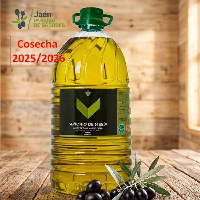 Aceite de oliva virgen extra de la variedad picual, certificado con la D.O. "Sierra Magina", procedente de aceituna recolectada a partir del mes de noviembre con un mayor grado de maduración que el de cosecha temprana.