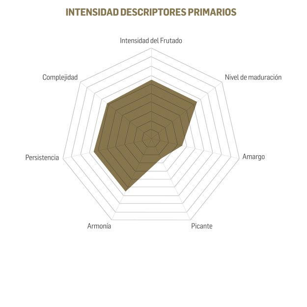 Aceite de gran cuerpo con un suave amargor y picor indicativos de la variedad Picual, intenso frutado de aceitunas frescas, gran complejidad de aromas a herbáceos y frutales destacando el plátano verde, tomate verde y la almendra verde, es un aceite de gran complejidad debido a la multitud de atributos positivos que se aprecian.