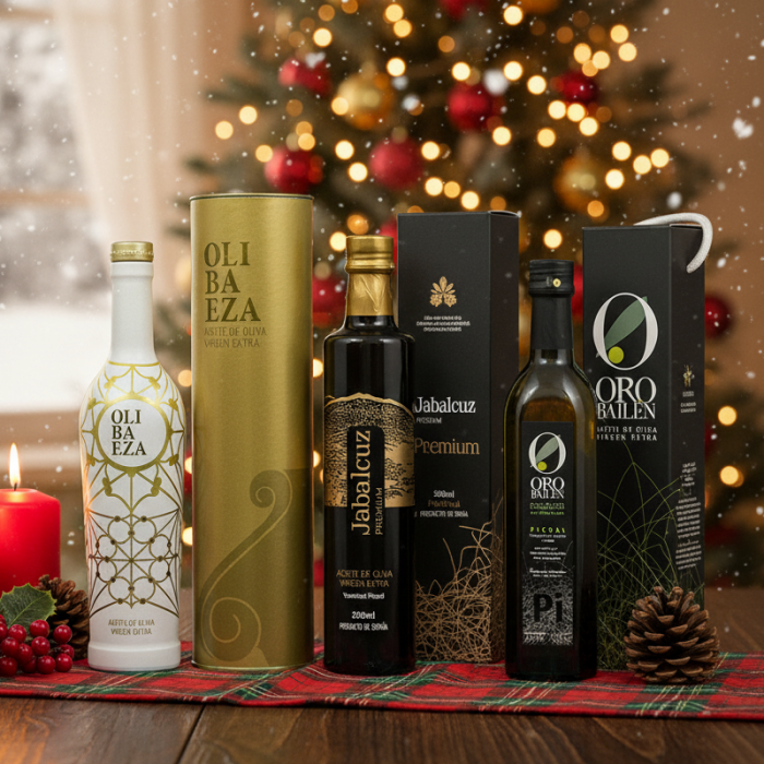 Sorprende con un detalle único y elegante: nuestro estuche regalo de Aceite Olibaeza Patrimonio Dorado Picual, Jabalcuz Premium Picual y Oro de Bailen Premium Picual
