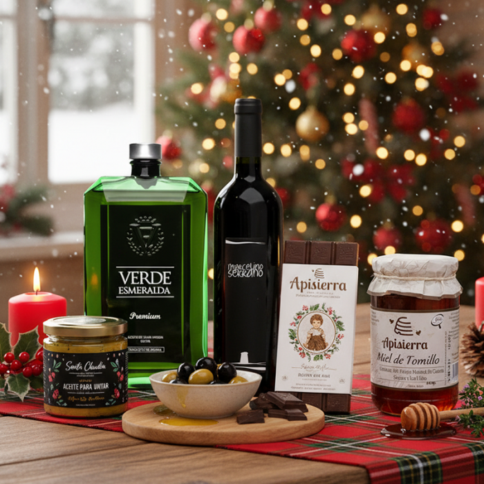 Sorprende con un detalle único y elegante: nuestro estuche regalo con una combinación única de sabores, AOVE Premium, Vino Reserva, Mermelada de Aceite Premium, Chocolate Artesano y Miel Pura de Jaén.