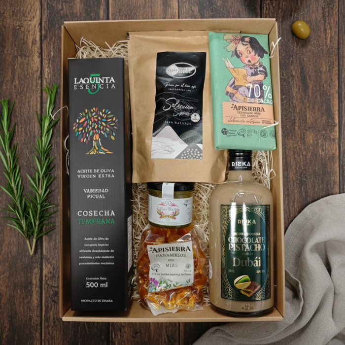 Sorprende con un detalle único y elegante: nuestro estuche regalo con Aceite Quinta Esencia Premium, Licor Crema de Chocolate y Pistacho, Café Sierra de Segura Superior Molido, Chocolate Artesano Canela, Mermelada de Aceite Santa Claudia y Caramelos Artesanos de Miel.