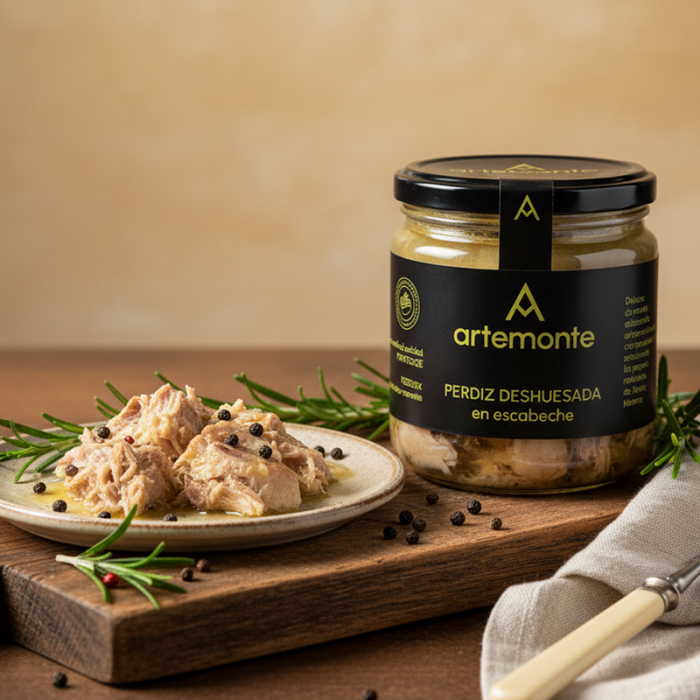 Perdiz deshuesada en escabeche siguiendo las recetas tradicionales de Sierra Morena y con un proceso de producción completamente artesanal.