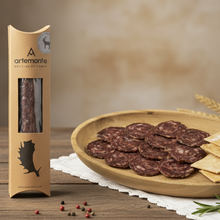Salchichón de gamo elaborado de forma artesanal con refinadas especias naturales, siguiendo las recetas tradicionales de Sierra Morena. Un embutido gourmet con el sello de calidad de Artemonte y un toque de singularidad y distinción.