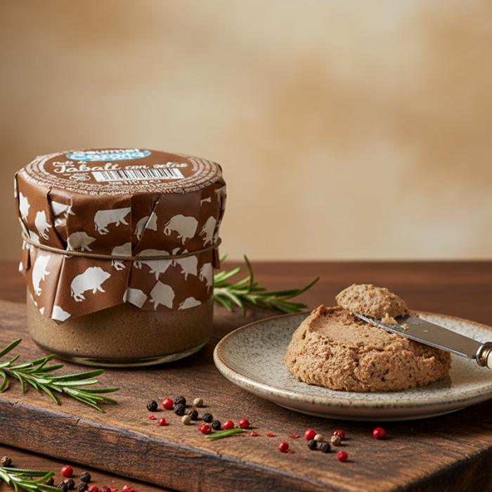 El paté de jabalí con setas es un producto de gran calidad, tiene una textura muy suave y untuosa las setas aportan un intenso y sugerente sabor. Resulta delicioso degustarlo sobre una fina tostada, acompañado de unas pasas.
